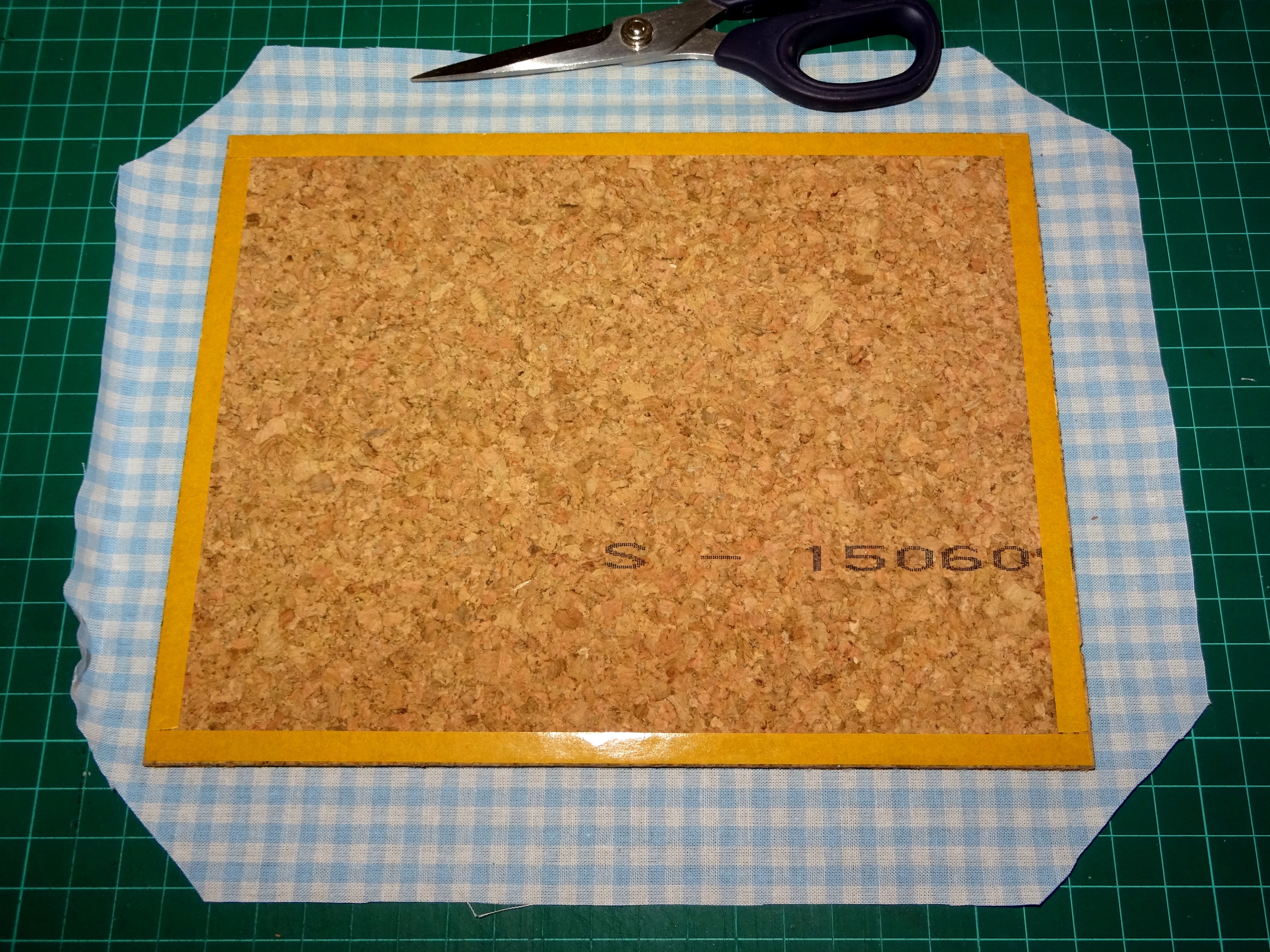 Cut a piece of the pretty fabric about an inch larger all around the edge than the cork and place it right side down on your work surface. Place the lined side of the cork on top, making sure that it is straight, and trim the corners as shown.