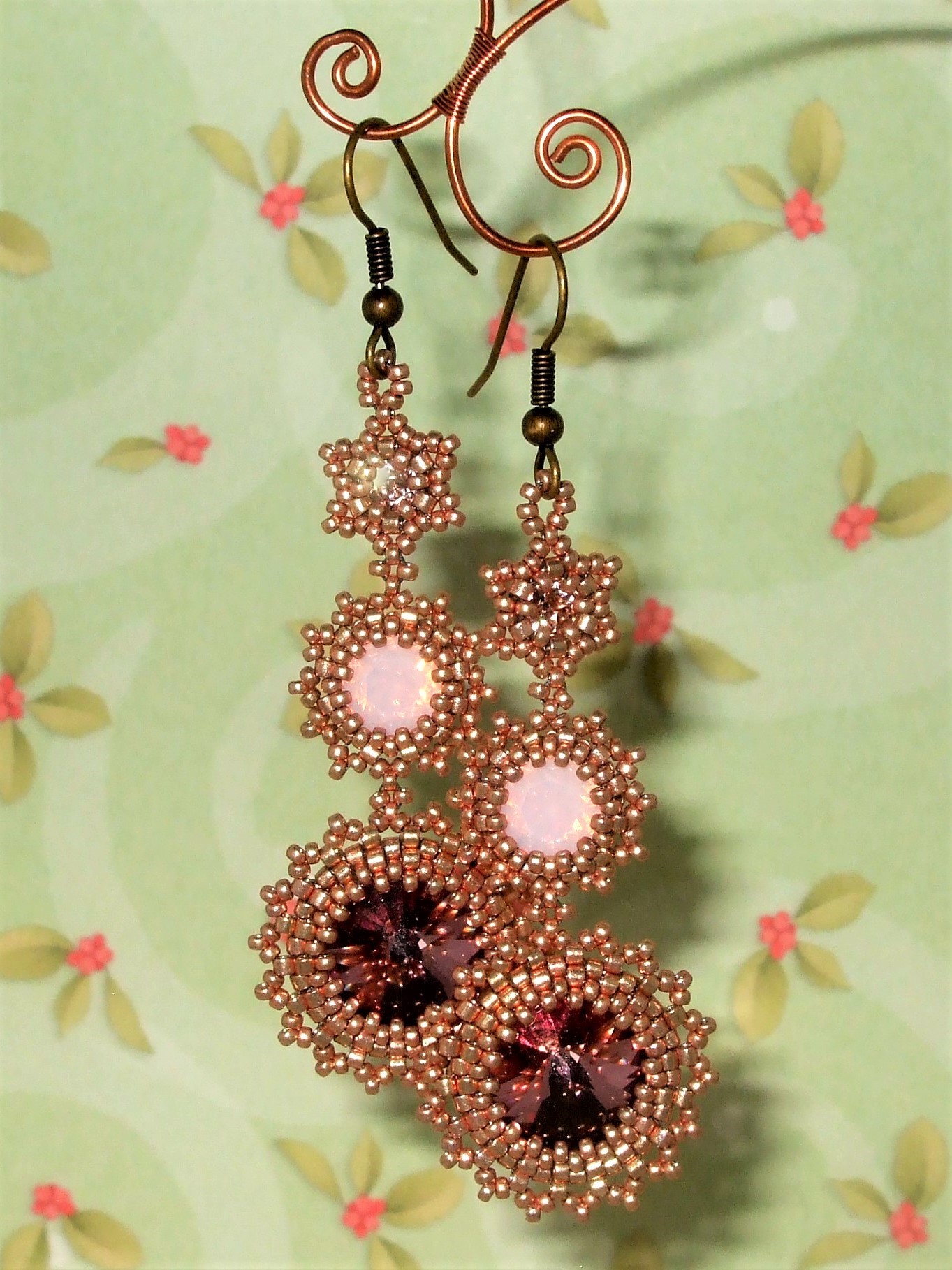 In this workshop you will learn how to create bezels for a Swarovski crystal rivoli and chatons, then join them together into these sparkling earrings. You can choose from either silver or champagne gold beads to create the bezels. Each kit contains a different colour combination of rivolis and chatons, and includes a printed copy of the tutorial for you to take home.